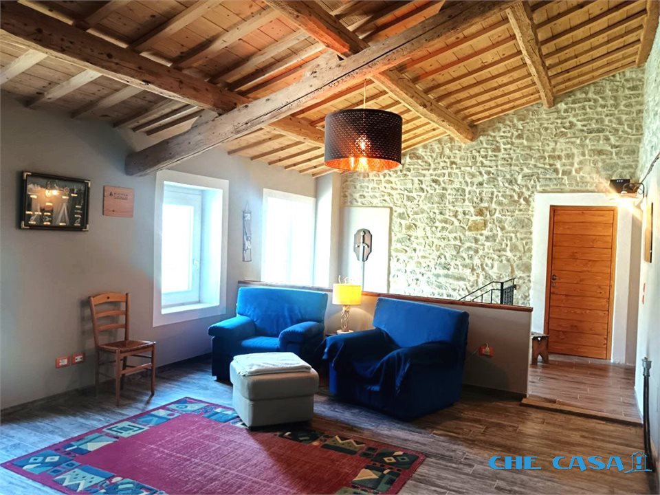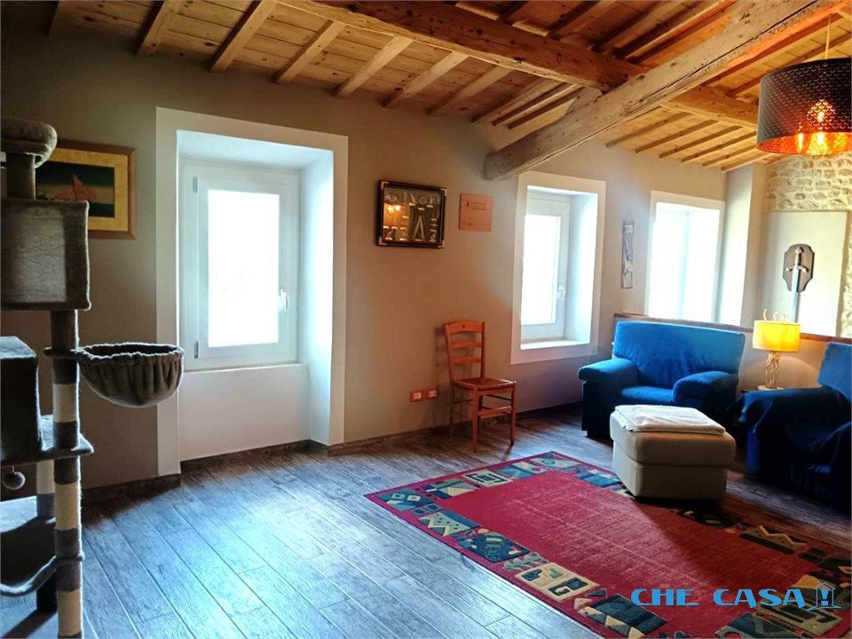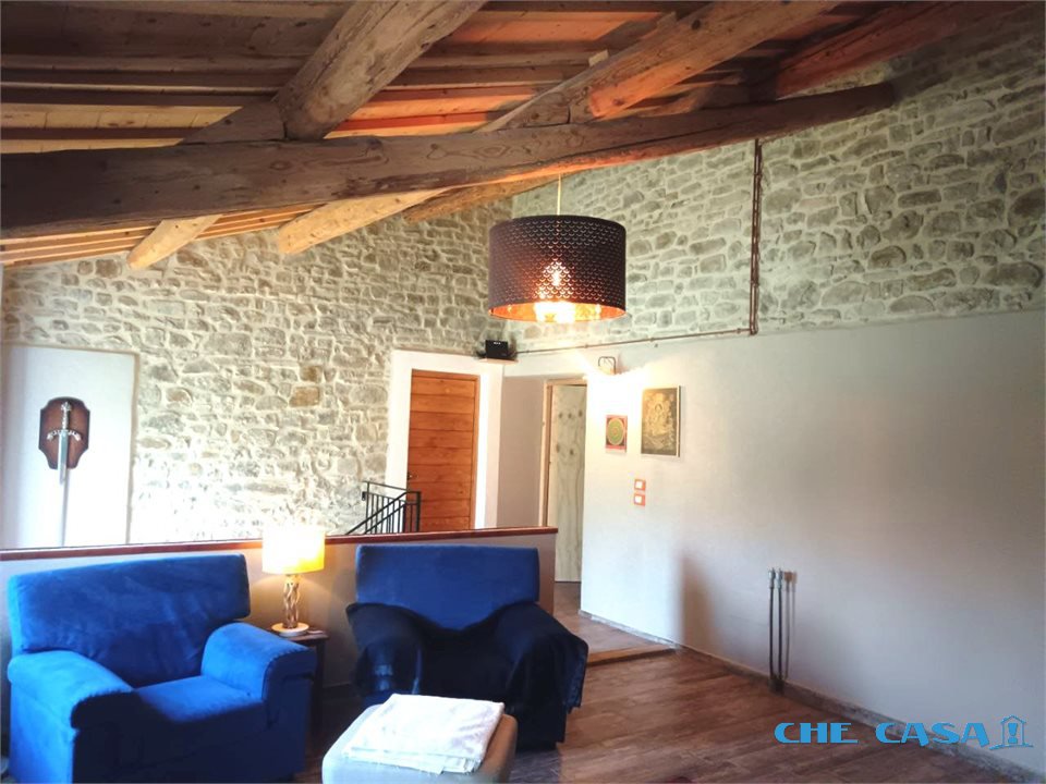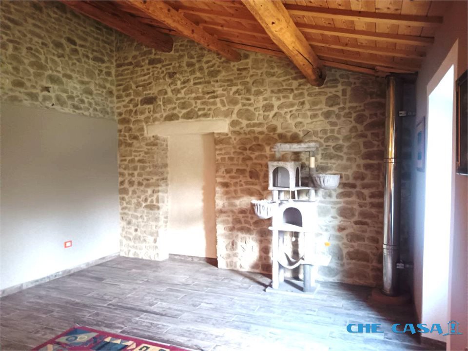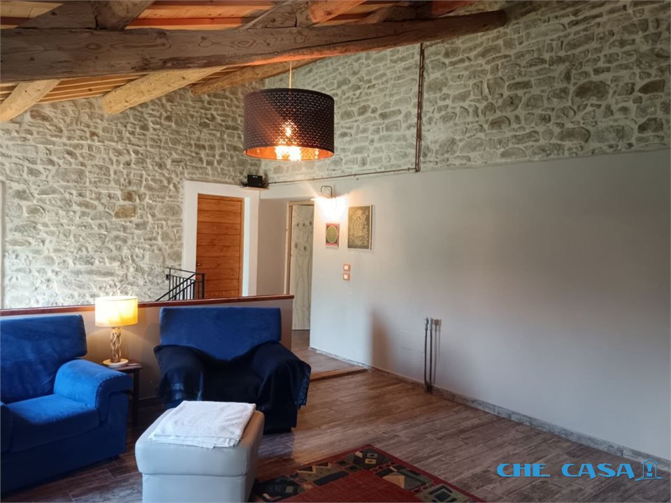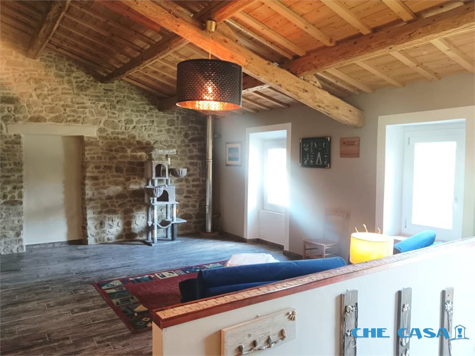 TAVOLETO: Casa abbinata su un lato con ampio giardino esclusivo di circa 1300 mq. La casa è disposta su 2 livelli con al piano terra ampia zona giorno con cucina abitabile, bagno e locali uso lavanderia e cantina. Al primo piano, collegato tramite comoda scala, sono presenti 3 camere da letto oltre a un ampio open space. Le camere sono tutte matrimoniali, una ancora in fase di ristrutturazione. Al piano è presente un bagno con doccia. L'immobile è stato ristrutturato recentemente con travi in legno e sasso a vista in stile rustico. La caldaia è nuova e a condensazione e alimentata tramite bombolone interrato. Attualmente i proprietari utilizzano una stufa a legno di ultima generazione installata al piano terra che rimarrà al momento della vendita. Sul terreno è presente un capanno in muratura da ristrutturare dove si possono recuperare altri locali uso sgombero, garage o portico. Per maggiori informazioni o per fissare un appuntamento di visita contattare il numero 0541858082 Agenzia Che-Casa! Morciano Di Romagna